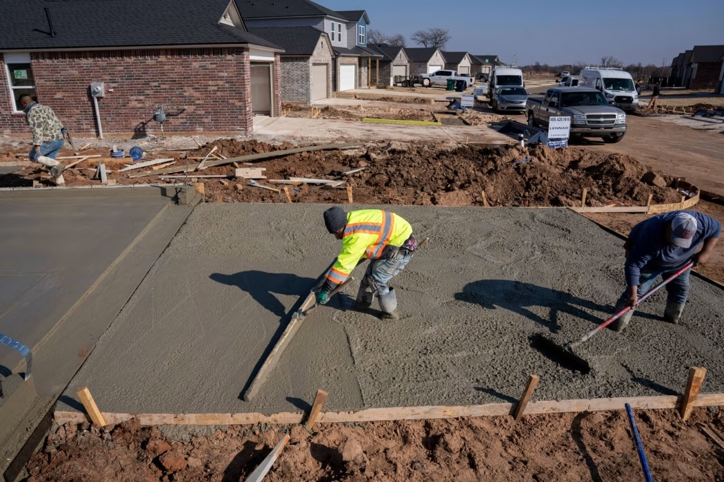 工人们上个月在俄克拉荷马州育空地区一栋在建房屋前完成了一条混凝土车道。图片来源:NICK OXFORD/BLOOMBERG NEWS