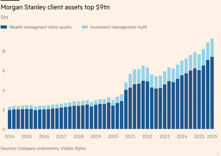 在资产管理方面,银行已将业务扩展到资产管理领域,以稳定其波动性更大的投资银行和交易业务。摩根士丹利的客户资产在第四季度首次超过9万亿美元。