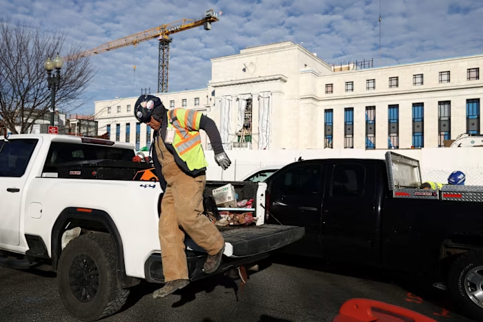 美联储25亿美元修复工程现场的一名工人。司法部对鲍威尔的调查重点在于他是否就大楼计划的变更误导了国会。© Kevin Lamarque/路透社