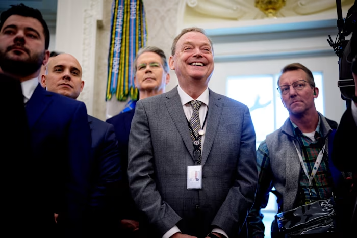 财政部长斯科特·贝森特(Scott Bessent),后排中间;国家经济委员会主任凯文·哈塞特(Kevin Hassett),前排中间。两人都公开支持对美联储的调查,但据说贝森特私下告诉特朗普不要对鲍威尔进行调查。© Andrew Harnik/Getty Images