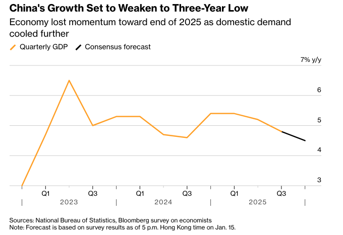周一公布的中国数据可能显示,第四季度经济依然乐观,但2025年可能以三年来最弱的季度增长收官。根据彭博社的一项调查,预计截至12月31日的三个月,国内生产总值(GDP)同比增长4.5%,低于上一季度的4.8%。