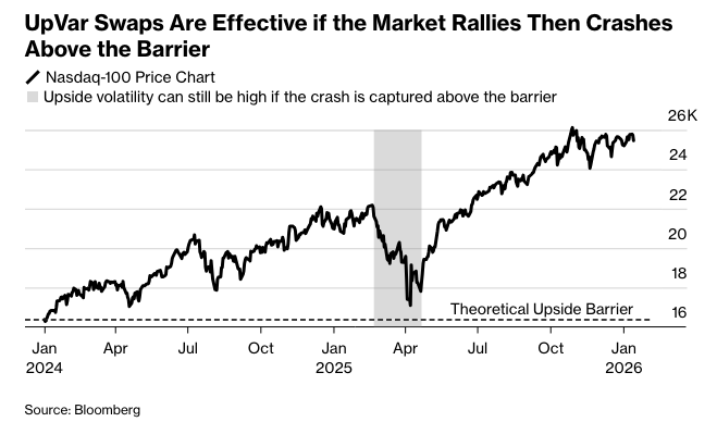 美国银行、摩根大通和巴克莱的策略师一直在推销标普500或纳斯达克100所谓的“UpVar互换”,期限为一到两年。由于定价主要集中在通常更便宜的看涨期权行权价上,而不是波动性更高的看跌期权上,因此这些互换产品比普通的方差互换有很大的折扣。