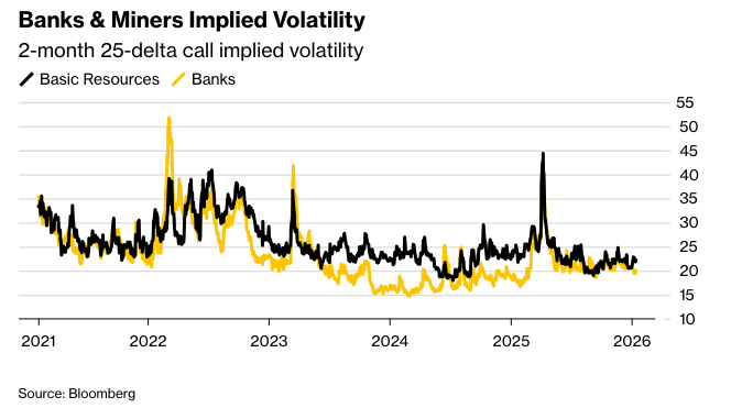 欧洲矿业公司也引起了衍生品策略师的关注,他们在斯托克600基本资源指数上进行了上涨交易。巴克莱策略师在最近的一份报告中写道,由于中国潜在的支持以及对人工智能主导的基础设施的需求,该行业的基本面可能会改善。他们认为,鉴于低波动率和扁平的看涨期权偏斜,看涨期权价差具有吸引力。