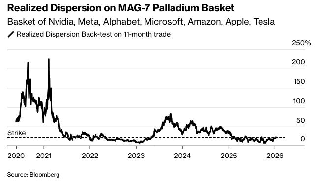 大型科技股仍然可能引领市场上涨,而“七巨头”的期权并不特别便宜。因此,巴克莱银行的策略师表示,直接购买看涨期权并不划算,一种所谓的“钯金”结构——押注一篮子股票收益或损失的分散程度,而不是押注篮子本身的表现——更为理想。