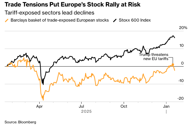 特朗普威胁要对反对他声称对格陵兰岛拥有管辖权的国家征收关税,这可能重新点燃他第二任期初几个月令市场动荡的局面。在欧洲官员表示他们不太可能退让并正在考虑报复后,抛售加剧。