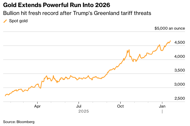 由于唐纳德·特朗普总统加紧推动收购格陵兰,引发了美国与欧洲之间可能爆发破坏性贸易战的担忧,黄金和白银价格飙升至历史新高。