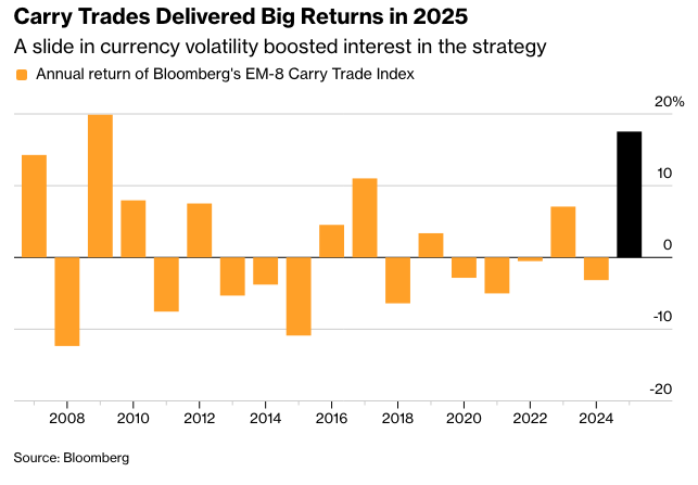 在很大程度上,由于去年外汇波动率跌至多年来的低点,套利交易蓬勃发展。彭博社一项衡量该策略的指标(涉及买入八种新兴市场货币兑美元)的回报率约为18%。