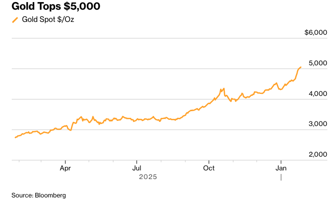 股票和债券的温和上涨被繁忙一周开始之际能源、商品和外汇市场的剧烈波动所掩盖。美元跌至2022年以来的最低水平,黄金突破5000美元,由于寒冷天气席卷美国大部分地区,天然气飙升近30%。