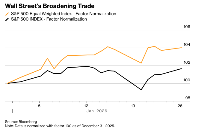 事实上,2026年初的市场表现的特点是股票市场的广度扩大。虽然标普500指数今年上涨了1.5%,但其等权重版本——它赋予达乐公司(Dollar Tree Inc.)与苹果公司(Apple Inc.)相同的权重——上涨了约4%。