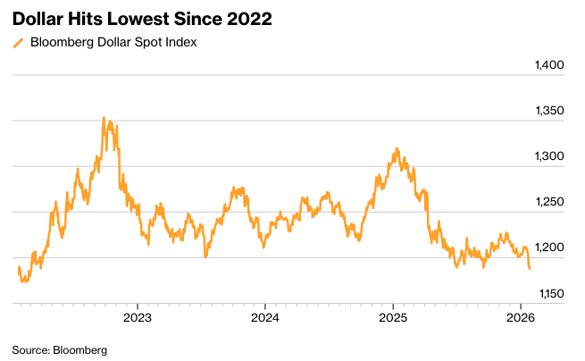 彭博美元现货指数下跌0.4%,至近四年来的最低水平