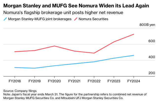 然而,要取代野村并非易事。尽管摩根士丹利三菱日联证券和三菱日联摩根士丹利证券正努力在综合净收入方面超越野村旗下旗舰本土经纪子公司,但过去两年差距已经扩大。