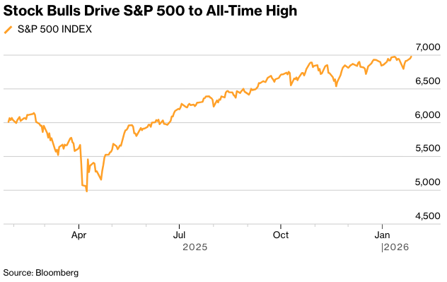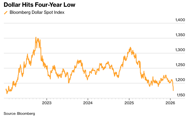华尔街交易员推动股市升至历史新高,原因是他们预计稳健的企业盈利将继续推动市场上涨。美元跌至近四年来的低点。黄金价格突破5100美元。