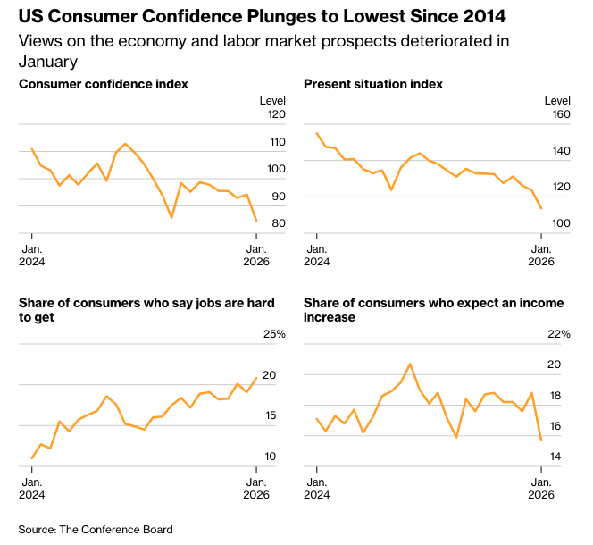 在美联储决策公布前夕,数据显示美国1月份消费者信心降至十多年来的最低水平,原因是人们对经济和劳动力市场的看法更加悲观。