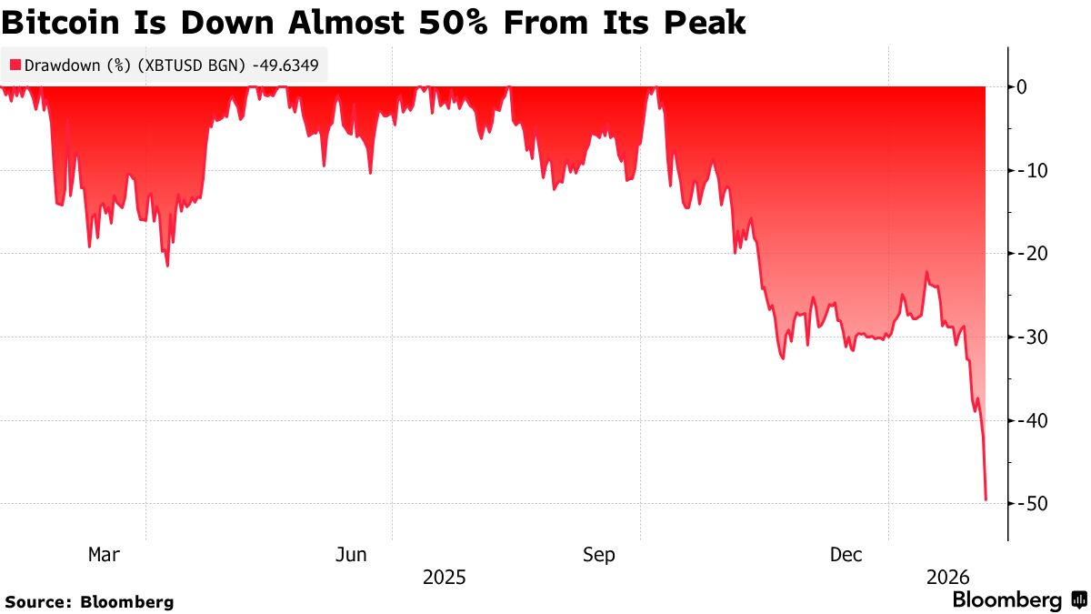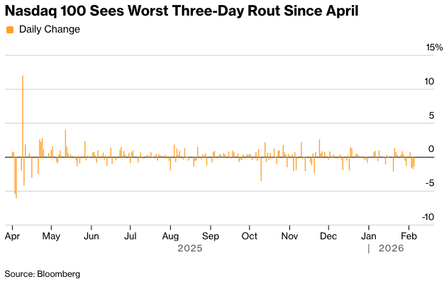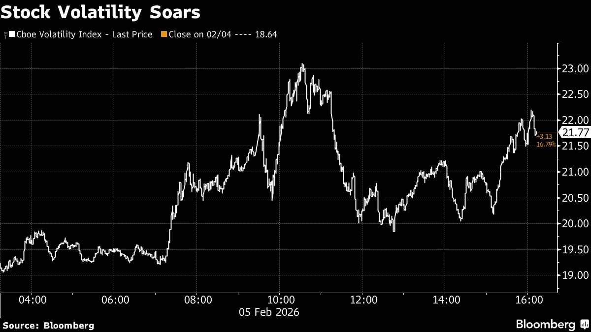 又一轮猛烈的抛售重创了软件股和加密货币,疲软的就业数据加剧了股市的暴跌,而此前人们担忧人工智能对估值的影响。比特币遭遇了有史以来最大的跌幅之一。在收盘时段,亚马逊公司(Amazon.com Inc.)的业绩公布后股价暴跌。