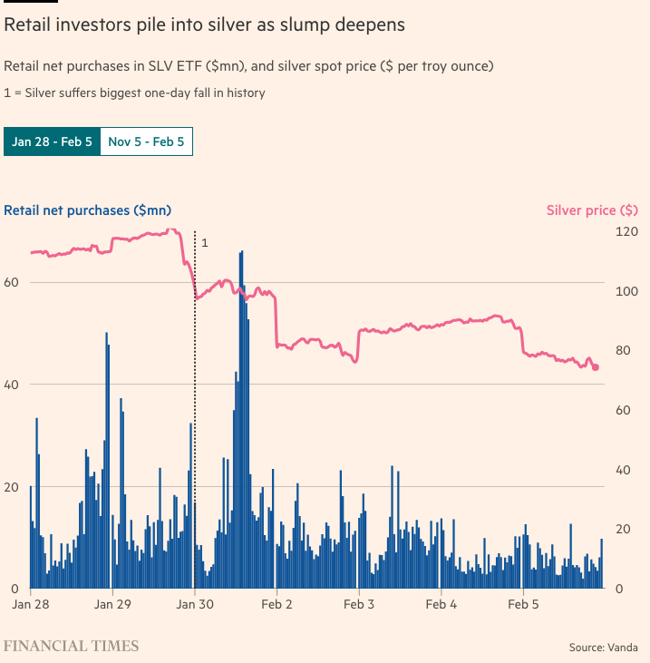 根据Vanda Research的数据分析,在截至周四的六个交易日内,散户投资者向最大的白银交易所交易基金SLV投入了4.3亿美元,其中包括1月30日的超过1亿美元,当时白银价格下跌了27%,创下历史最大单日跌幅。