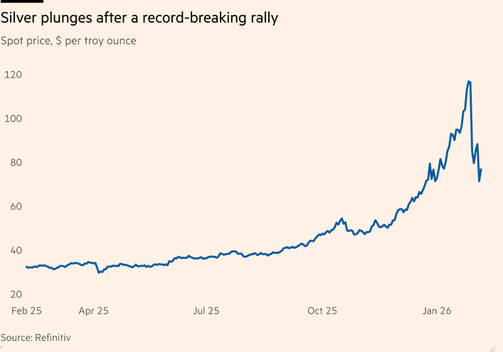 周一,白银价格下跌了6%,周二反弹了7%,但周四却暴跌了近20%。 周五,白银在早盘交易中一度下跌了10%,随后反弹收盘上涨了9.5%。