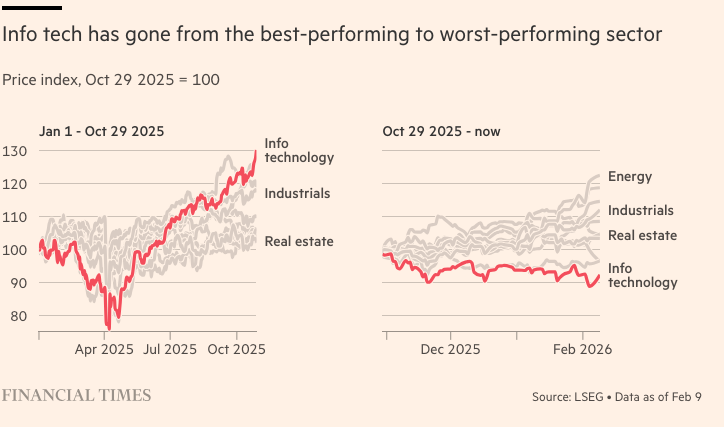 资金流入提振了一批此前不受欢迎的行业,而许多去年表现最佳的公司表现挣扎,因为华尔街的人工智能热潮暂停,投资者担心这项技术对软件行业的影响。