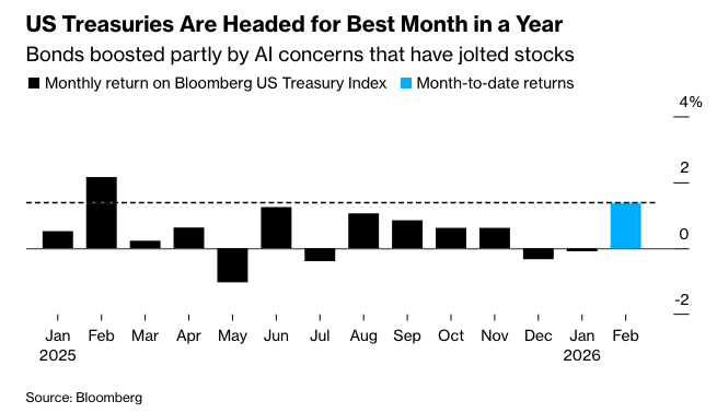由于人们对人工智能的颠覆性影响、不断升级的地缘政治紧张局势以及对私募信贷中隐藏漏洞的担忧加剧,国债为期一个月的涨势在周五加速。