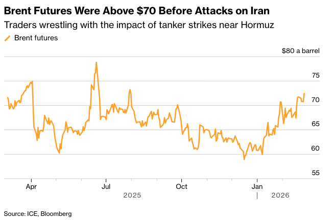 通常情况下,全球约五分之一的石油和液化天然气每天都要通过霍尔木兹海峡运输。距离石油市场开盘仅剩几个小时,大多数交易员表示,他们预计布伦特原油价格将从周五收盘时的每桶72.48美元大幅上涨。