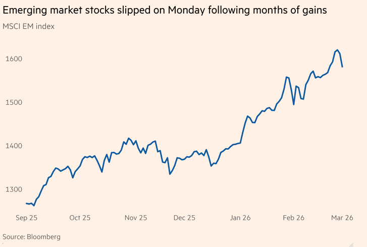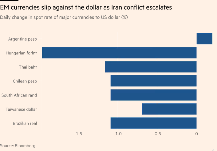 涌入新兴市场股票的对冲基金正在争先重新评估其头寸,因为美国和以色列对伊朗的袭击导致一些发展中国家的股票和货币下跌。