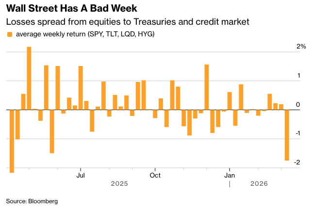 本周,由于中东地缘政治冲突给已经受到人工智能颠覆影响的市场带来了新的压力,抛售潮席卷了各个地区和资产类别。美国国债跌幅为去年关税风波以来最大,标普500指数遭遇了自去年10月以来最大的单周跌幅。新兴市场股市跌幅更大,创下2020年以来最大跌幅。