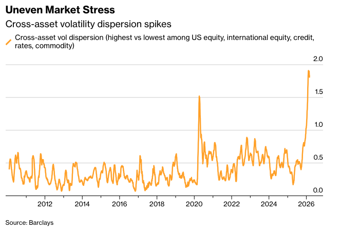 虽然几乎所有因素都汇集到了一起,但资产的变动幅度却差异巨大,加剧了市场失调。巴克莱银行的策略师(包括斯特凡诺·帕斯卡莱)按资产相对于自身历史的波动性对资产进行排名后发现,自2010年以来的数据显示,顶部和底部资产之间的压力差距从未如此之大。