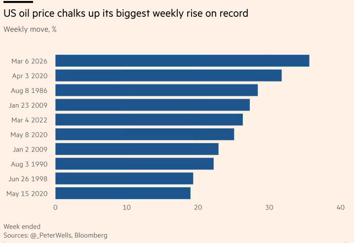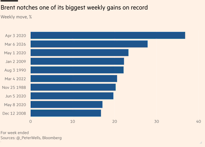 本周布伦特原油的涨幅比2022年俄罗斯全面入侵乌克兰之初的涨幅还要快,尽管仍远低于当时的120美元以上的峰值。
