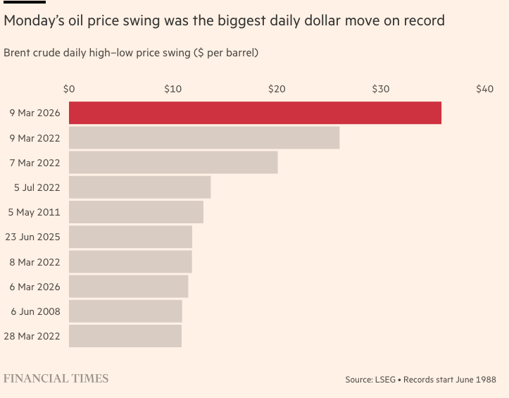 在接下来的23个小时里,基准布伦特原油价格飙升至每桶119美元的高位,随后暴跌至84美元,创下了美元计价的最大日内波动纪录。