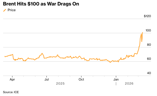 布伦特原油收盘价自2022年以来首次突破100美元,霍尔木兹海峡的封锁扼杀了通过贸易动脉的石油运输。标普500指数下跌1.5%,跌至11月以来的最低水平。由于私募信贷基金的赎回请求迫使摩根士丹利和Cliffwater LLC限制提款,银行股价下跌。德意志银行表示,在该行业的风险敞口为300亿美元。大型股指标接近修正门槛。在深夜时段,Adobe公司发布了疲软的前景,并表示其首席执行官将辞职。