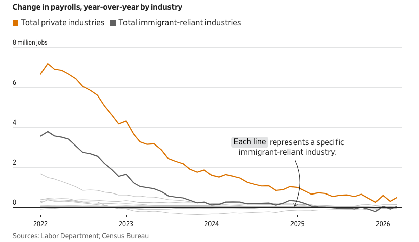 但《华尔街日报》的一项分析显示,自特朗普上任以来,受教育程度较低的移民过度集中的行业,工资增长速度慢于更广泛的私营部门。