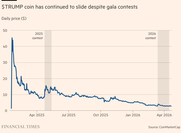 这场竞赛似乎并未提振$TRUMP代币低迷的价格。虽然三月份宣布比赛时曾短暂将其价格从2.90美元推高至4.05美元,但在4月14日比赛结束时已跌至2.88美元。