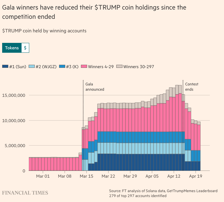 许多获胜者似乎在比赛结束后清算了他们的$TRUMP持有量。英国《金融时报》确认的获奖账户持有的代币总数,从峰值的1700万枚降至一周后的970万枚。