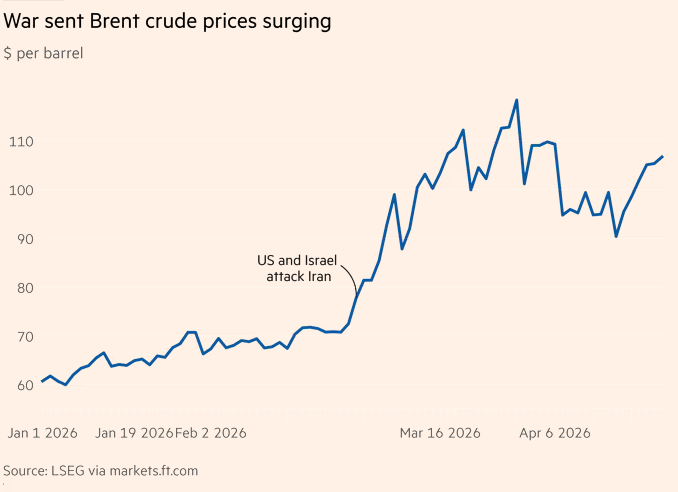 自4月17日以来,由于美国和伊朗之间的和平谈判陷入僵局,以及华盛顿对霍尔木兹海峡实施海上封锁,石油价格已经飙升超过20%。3月份,布伦特原油曾多次接近每桶120美元,但每次都迅速回落。