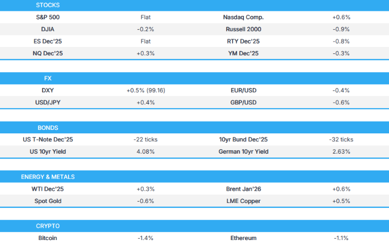 - 美国股市、国债和黄金遭遇显著抛售,而美元在美联储主席鲍威尔在新闻发布会上发表极其鹰派的言论后飙升。在此之前的决策中,美联储如预期般降息25个基点,至3.75-4%,尽管是以10票赞成、2票反对的结果通过。行长米兰如他所说的那样,反对降息50个基点,而施密德选择维持利率不变。美联储还宣布将从12月1日起结束资产负债表收缩;市场出现了双向波动。然而,鲍威尔在新闻发布会开始时表示,对于12月份如何行动存在强烈不同的意见,另一次降息远未确定。他补充说,今天的降息是又一次风险管理举措,但未来的情况有所不同。主席继续发表鹰派言论,指出越来越多的人认为他们应该等待一个周期[再考虑降息]。因此,市场出现了鹰派反应,美国国债下跌,标普500指数期货跌破6900点,现货黄金测试了每盎司3900美元的下行。