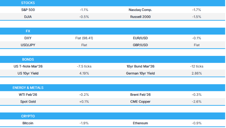 标普500指数(SPX)下跌1.07%,报6,827点;纳斯达克100指数(NDX)下跌1.91%,报25,197点;道琼斯工业平均指数(DJI)下跌0.51%,报48,458点;罗素2000指数(RUT)下跌1.51%,报2,551点。