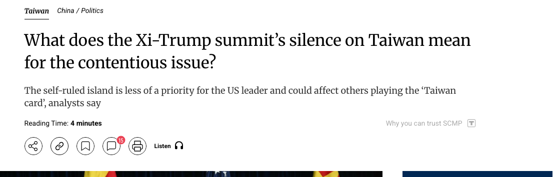 SCPM:What does the Xi-Trump summit’s silence on Taiwan mean for the contentious issue?